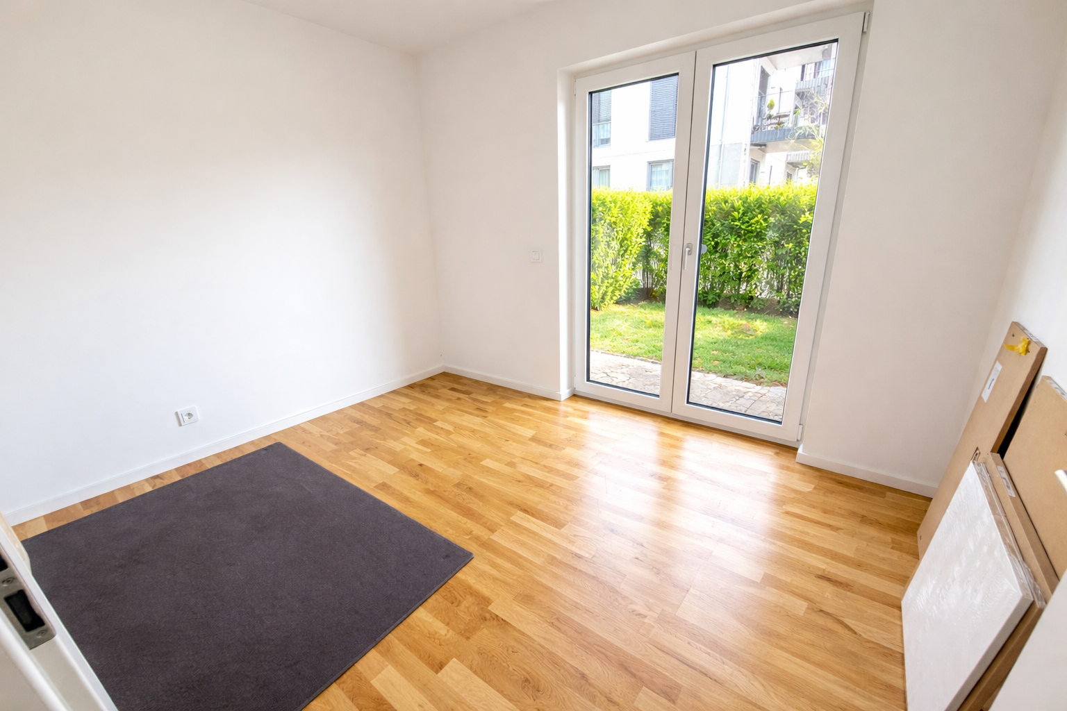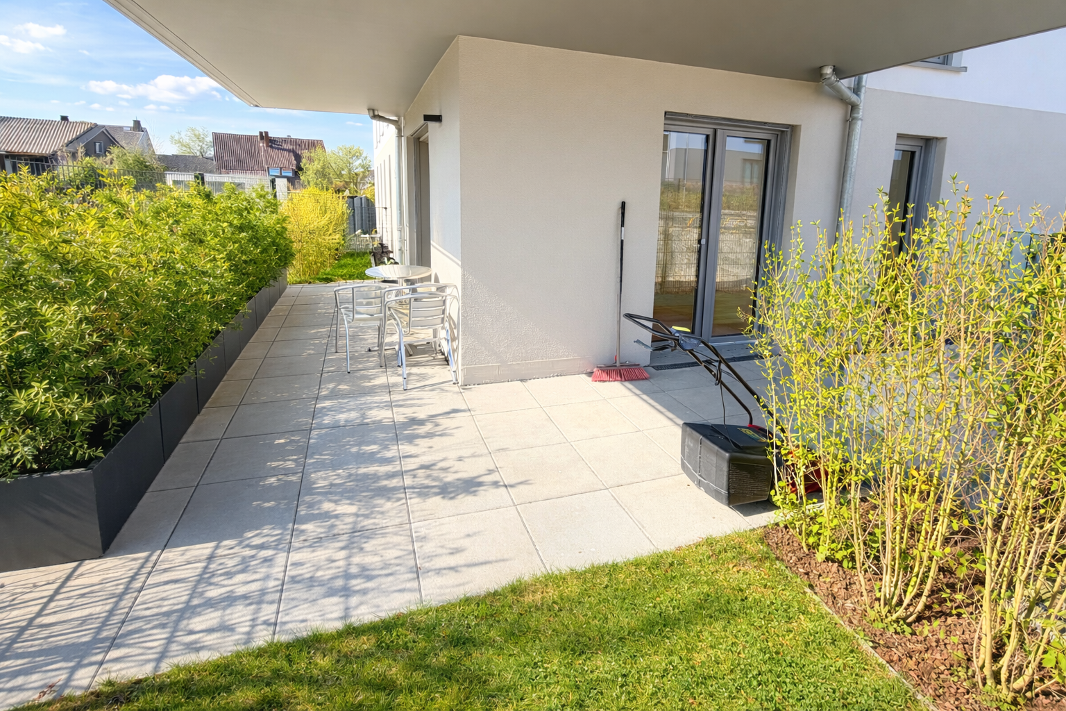 Vom Wohnzimmer aus gelangen Sie direkt auf die großzügige Terrasse mit eigenen Gartenanteil, der zusätzlichen Raum zum Entspannen im Freien bietet und den Wohnkomfort deutlich erhöht.