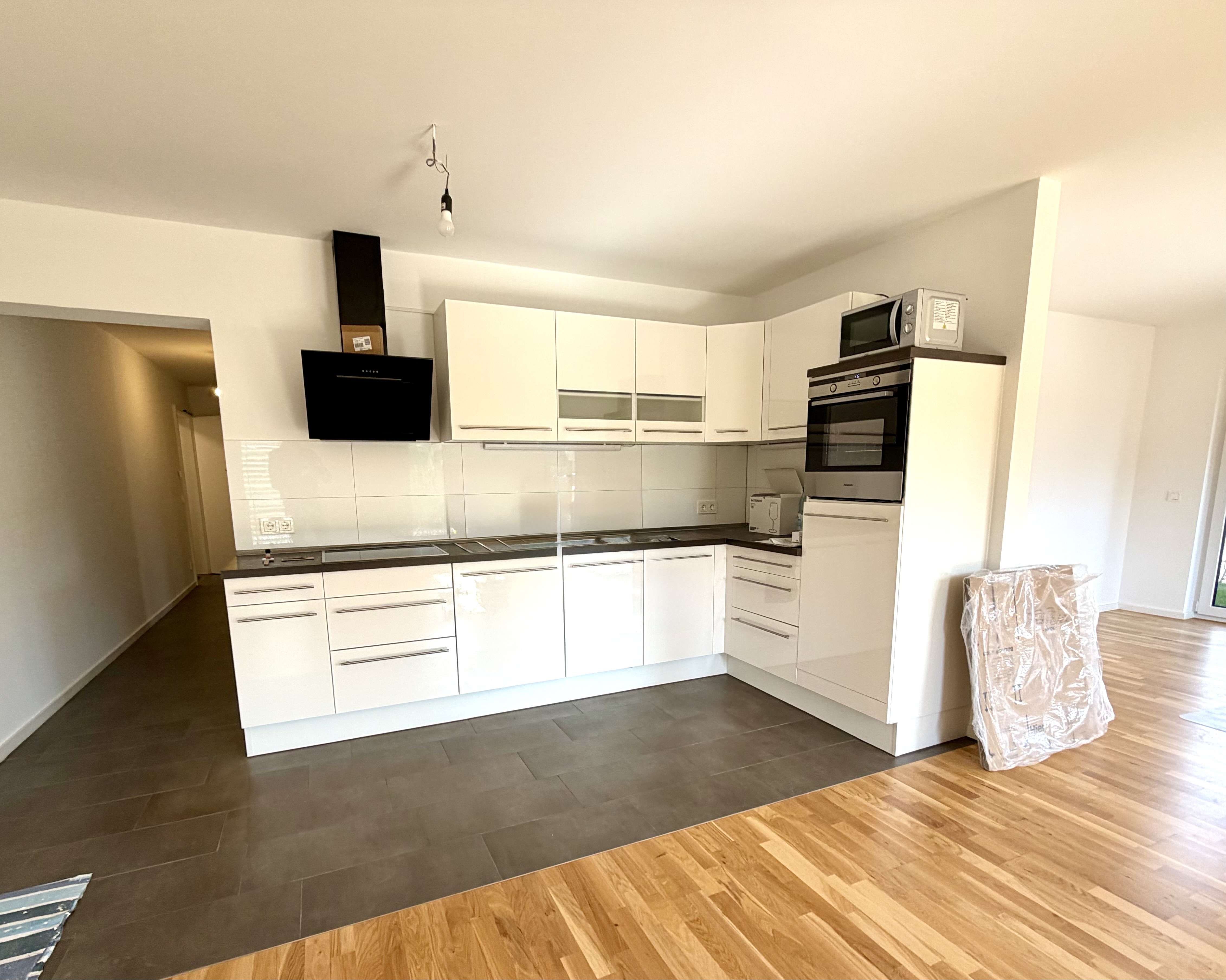 Das Herzstück der Wohnung bildet der großzügige, offene Wohn- und Essbereich, der durch seine moderne Gestaltung und große Fensterflächen besonders hell und einladend wirkt. In den Wohnbereich integriert ist eine hochwertige Einbauküche, die modernes Design mit Funktionalität verbindet.